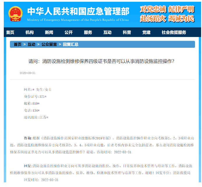 咨询:根据《消防设施操作员国家职业技能标准2019年版》,消防设施监控操作职业方向考核第1、2、3项职业功能,消防设施检测维修保养方向考核第2、3、4、5项职业功能,后者考核内容未完全包括前者,那么请问消防设施检测维修保养四级证书是否可以从事消防设施监控操作?谢谢。咨询时间:2022-03-31回复:消防设施监控操作职业方向可从事消防设施的监控、操作、日常保养和技术管理与培训等工作,消防设施检测维修保养方向可从事消防设施的操作、保养、维修、检测和技术管理与培训等工作。谢谢!回复单位:消防救援局 回复时间:2022-03-31
