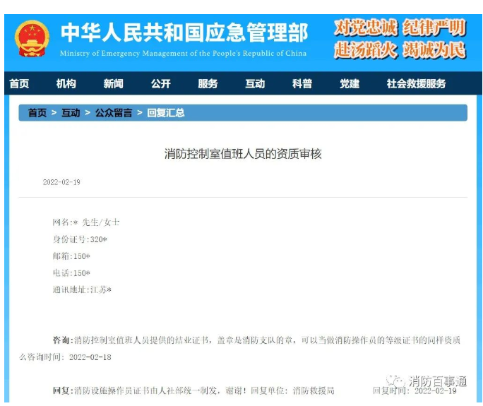 回复:消防设施操作员证书由人社部统一制发,谢谢!回复单位:消防救援局 回复时间:2022-02-19
