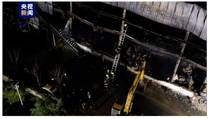 记者从现场了解到,着火厂房已经熏黑变形,内部结构基础设施损坏严重。(央视新闻)